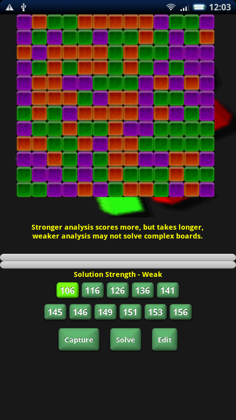 When you are happy with the screen capture, press OK and you will return to the main activity screen. You will see that 'Solve' and 'Edit' buttons have appeared. It's important that you doublecheck the board interpretation with the actual Cube Crash game as even a single cube error will likely mean the current solution will not meet the target.