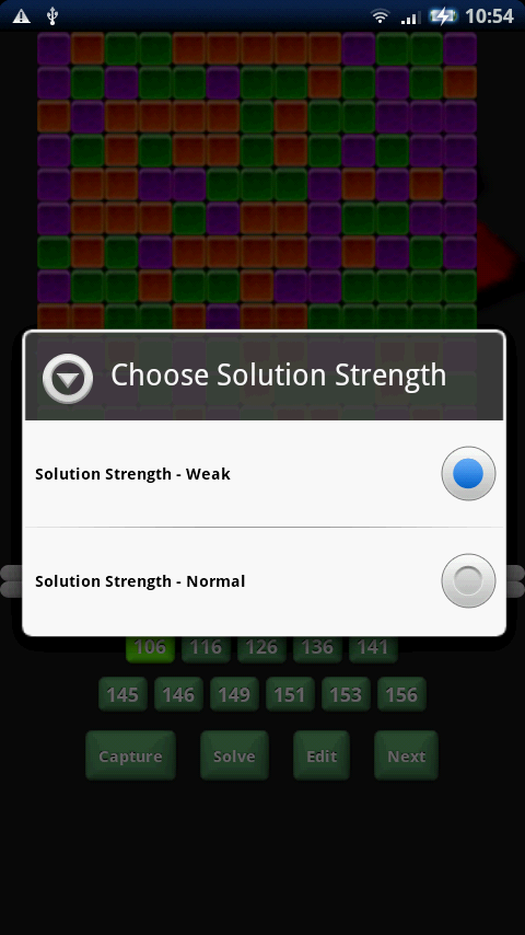 Back on the Main screen, press and hold the image to select the Solution Strength if it needs to be changed from the current selection. A context menu will pop up and you will be able to select a new solving strength. 'Weak' and 'Normal' are available on the 'Lite' version; a 'Strong' will be available on the fully functioning version.